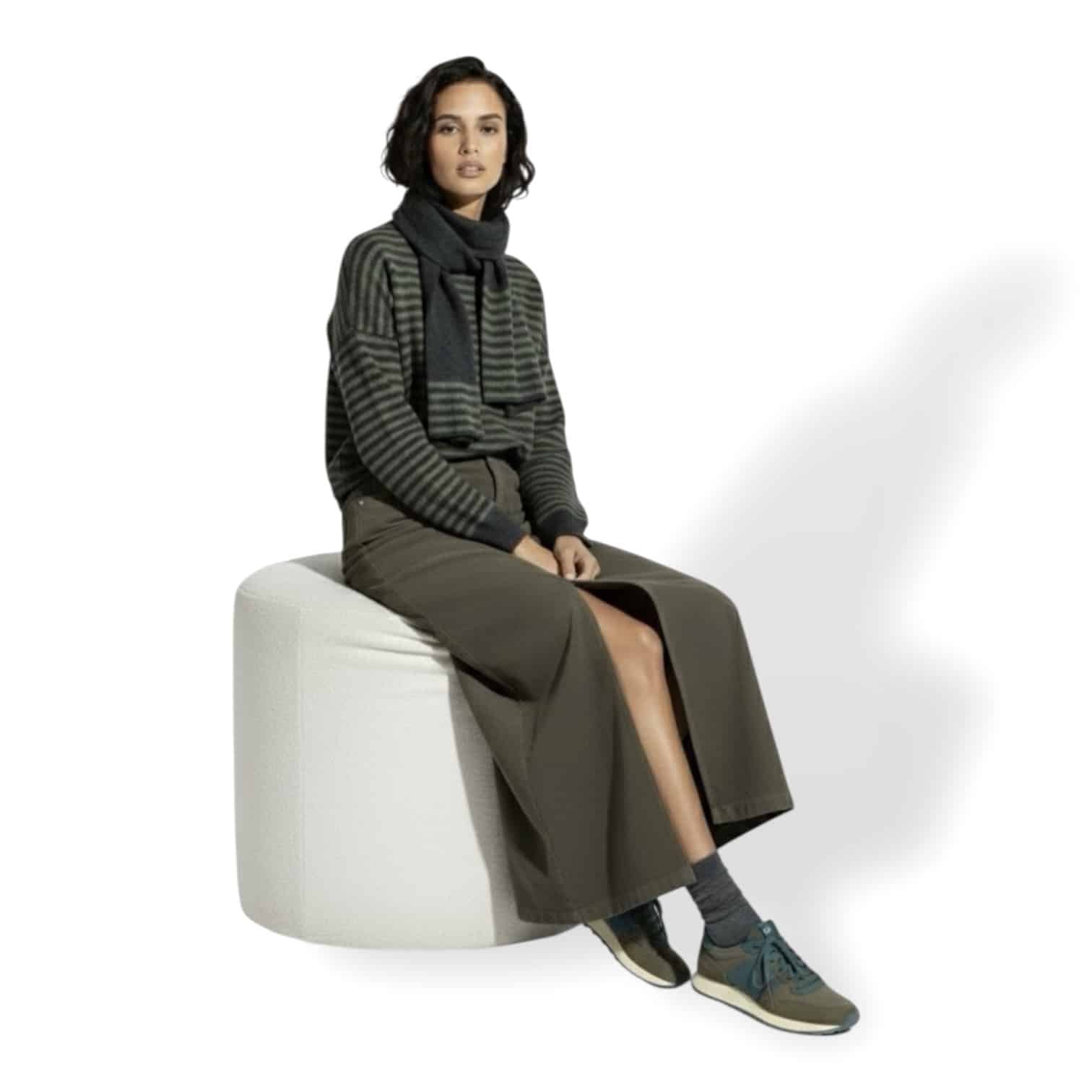 La stagione si apre con tonalità profonde e raffinate: bordeaux, verdi terrosi e marroni caldi si fondono con il petrolio, i grigi e i blu naturali, creando armonie sofisticate. Protagonista assoluto è il Vinaccia, simbolo di eleganza e carattere, accompagnato da viola, rosa, verde acqua, malva, arancio e azzurri polverosi. Capi spalla avvolgenti, camicette raffinate e l’intramontabile jeans danno forma a un autunno da vivere con equilibrio, comfort e stile.