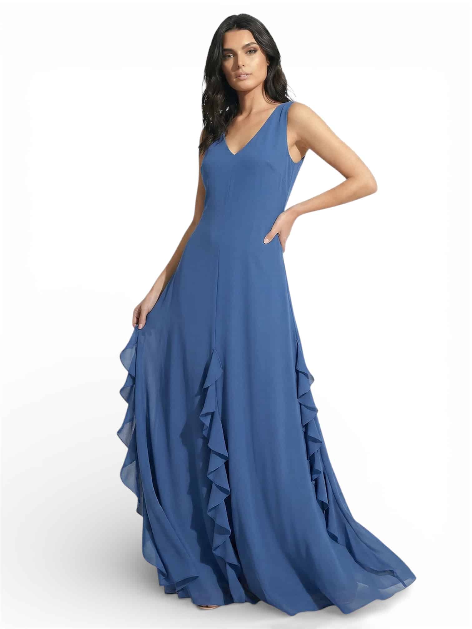 Abito in chiffon di seta godet scollato a V impreziosito da volant degradanti