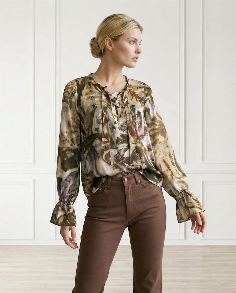 Un capo di carattere che cattura l’essenza della natura attraverso una stampa astratta pennellata. La palette cromatica spazia dai toni del fango e del verde oliva a tocchi di lavanda e crema, creando un effetto camouflage sofisticato.