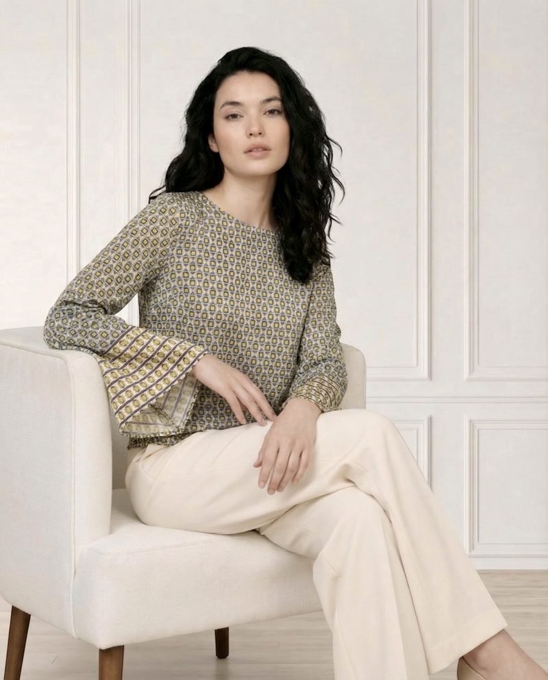 • Fantasia: Micro-pattern geometrico nei toni del giallo ocra, blu carta da zucchero e nero su fondo crema.