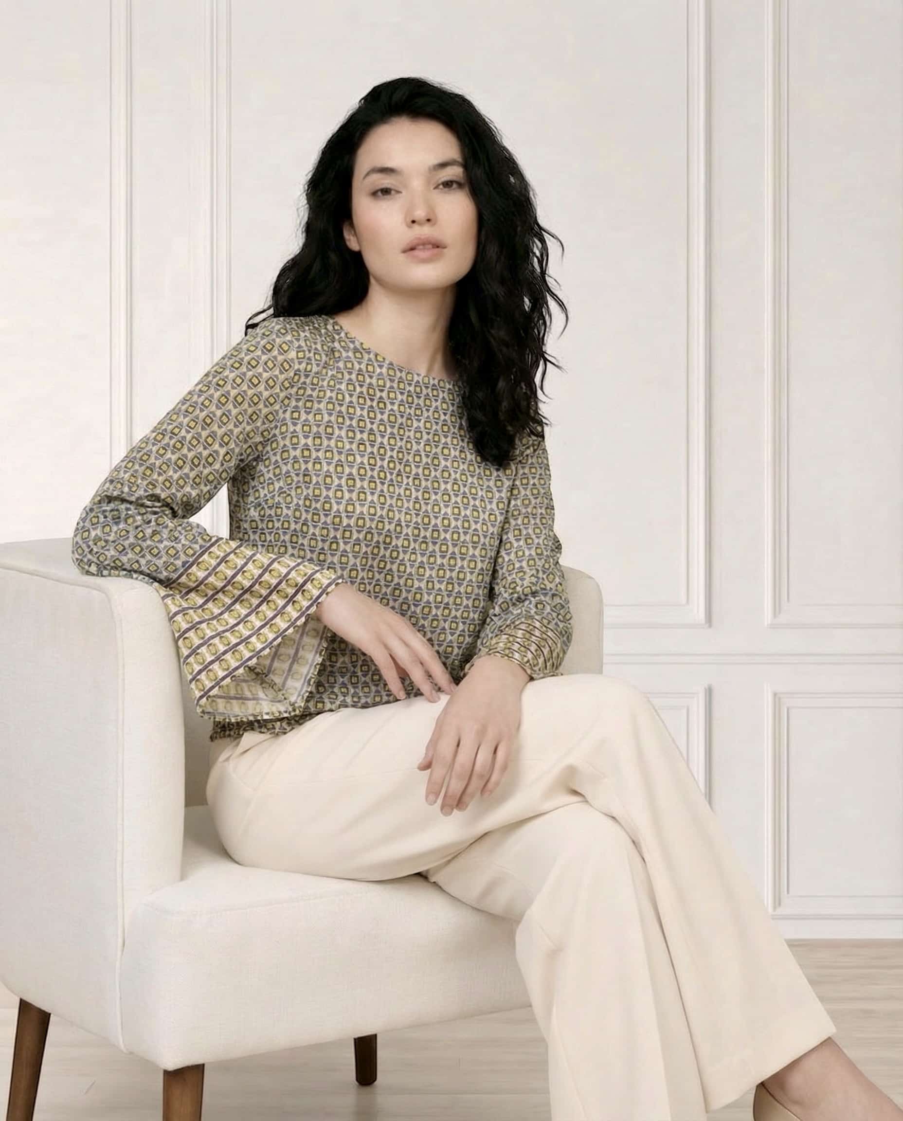 Un capo dal carattere deciso che unisce rigore geometrico e volumi scenografici. Questa blusa si distingue per la sua stampa optical all-over, ispirata alle atmosfere moderniste degli anni ’70.