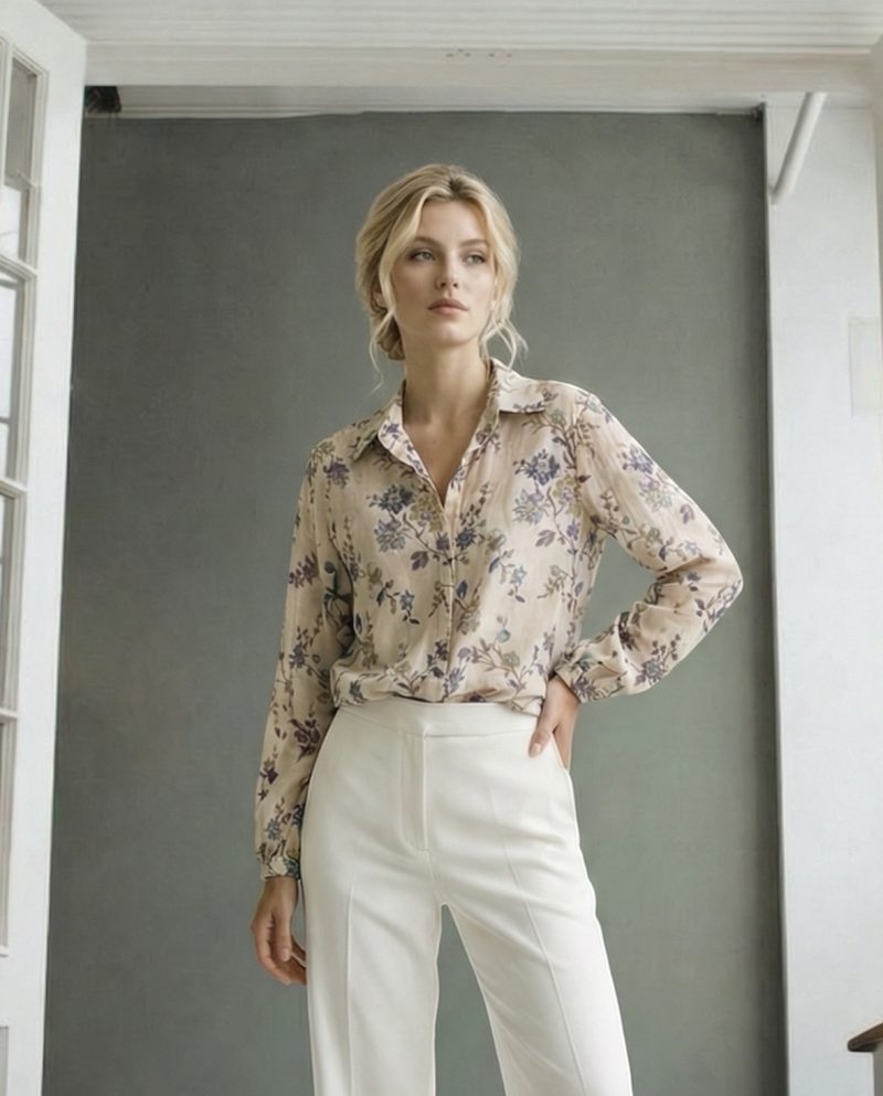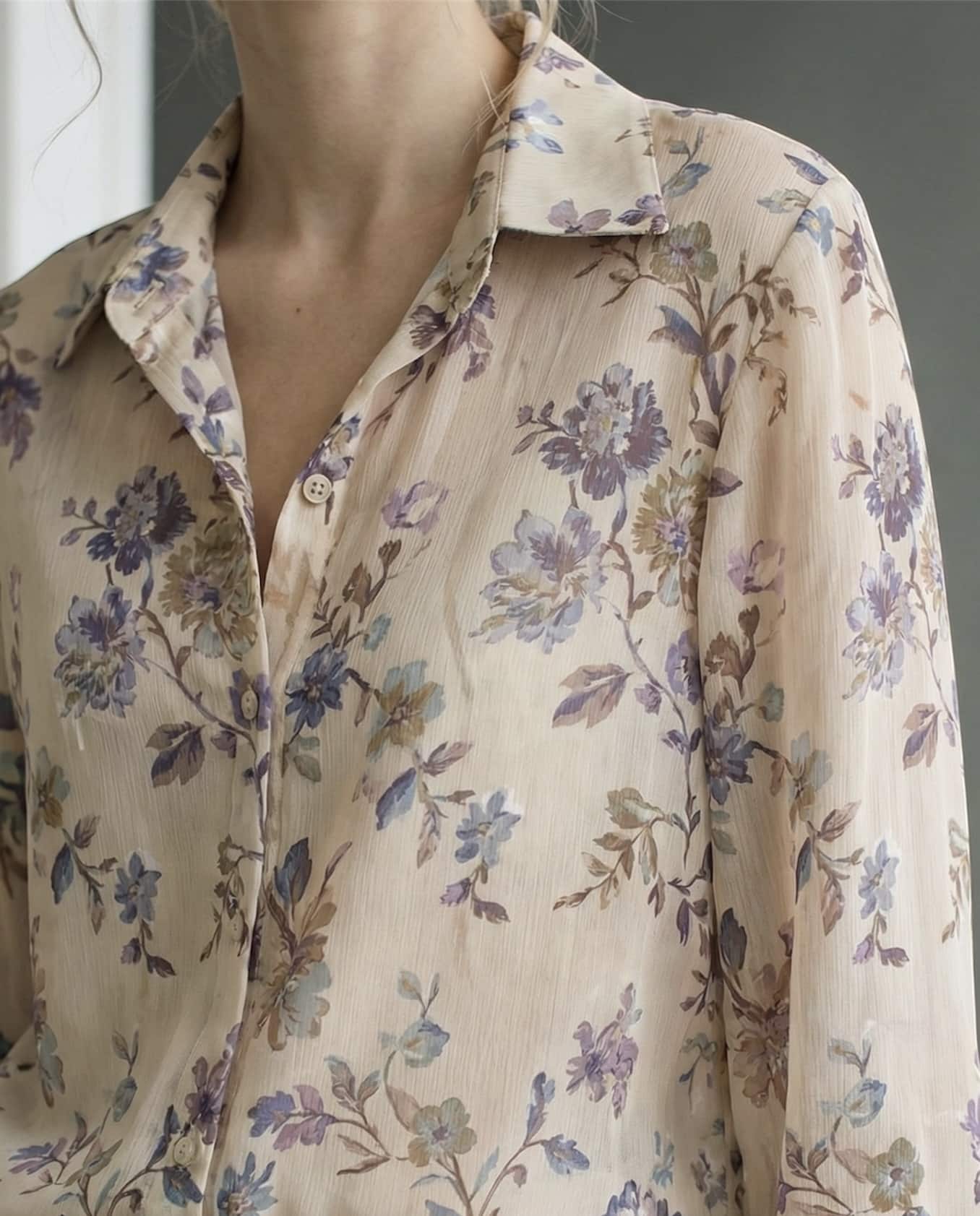 Elegante camicia dal fascino vintage, realizzata in chiffon leggero con una raffinata stampa botanica nei toni del glicine, lavanda e verde salvia su base cipria.